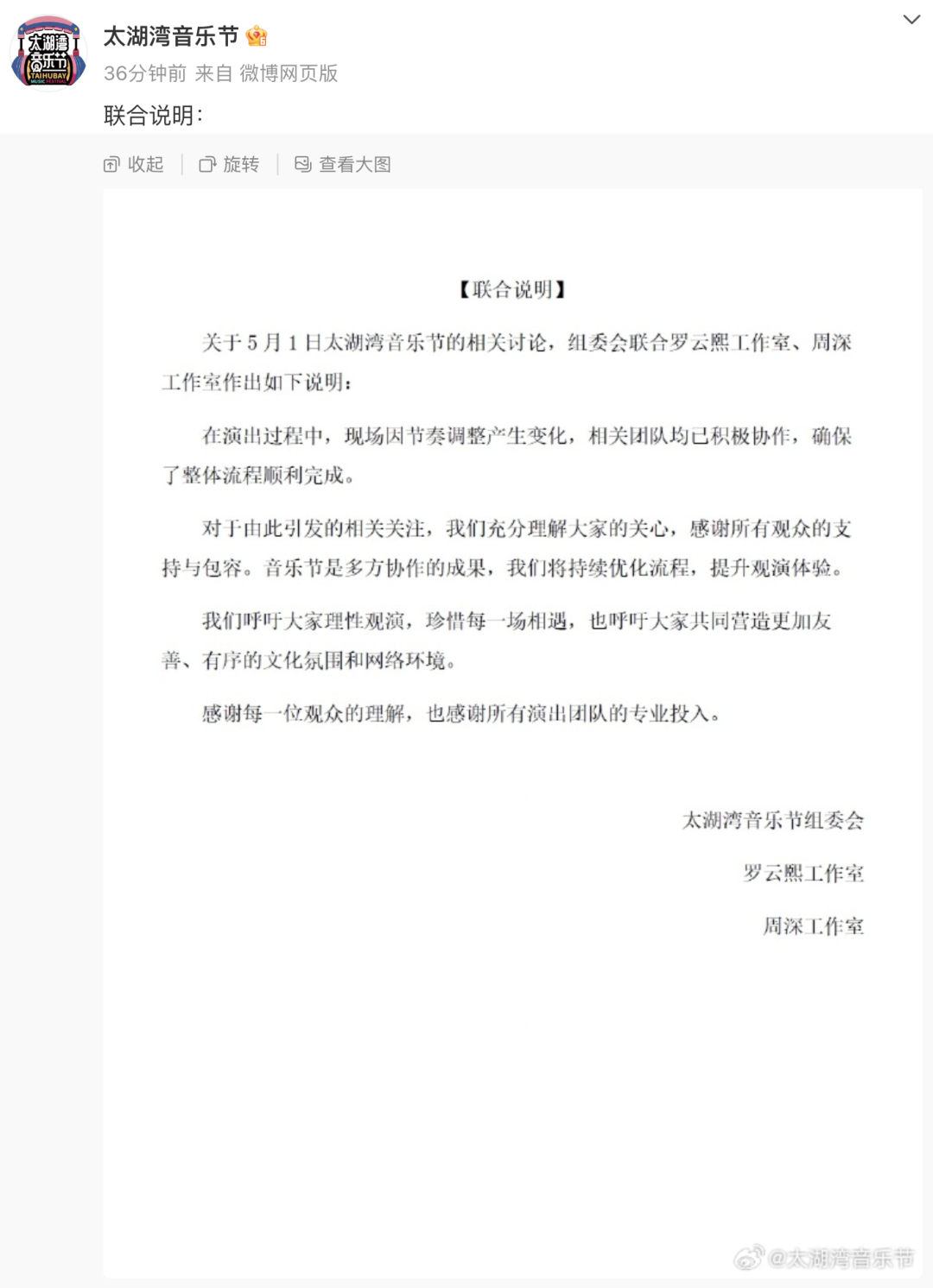5月4日,太湖湾音乐节组委会发表声明称,关于5月1日太湖湾音乐节的相关讨论,组委会联合罗云熙工作室、周深工作室作出如下说明: